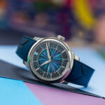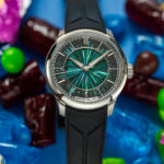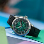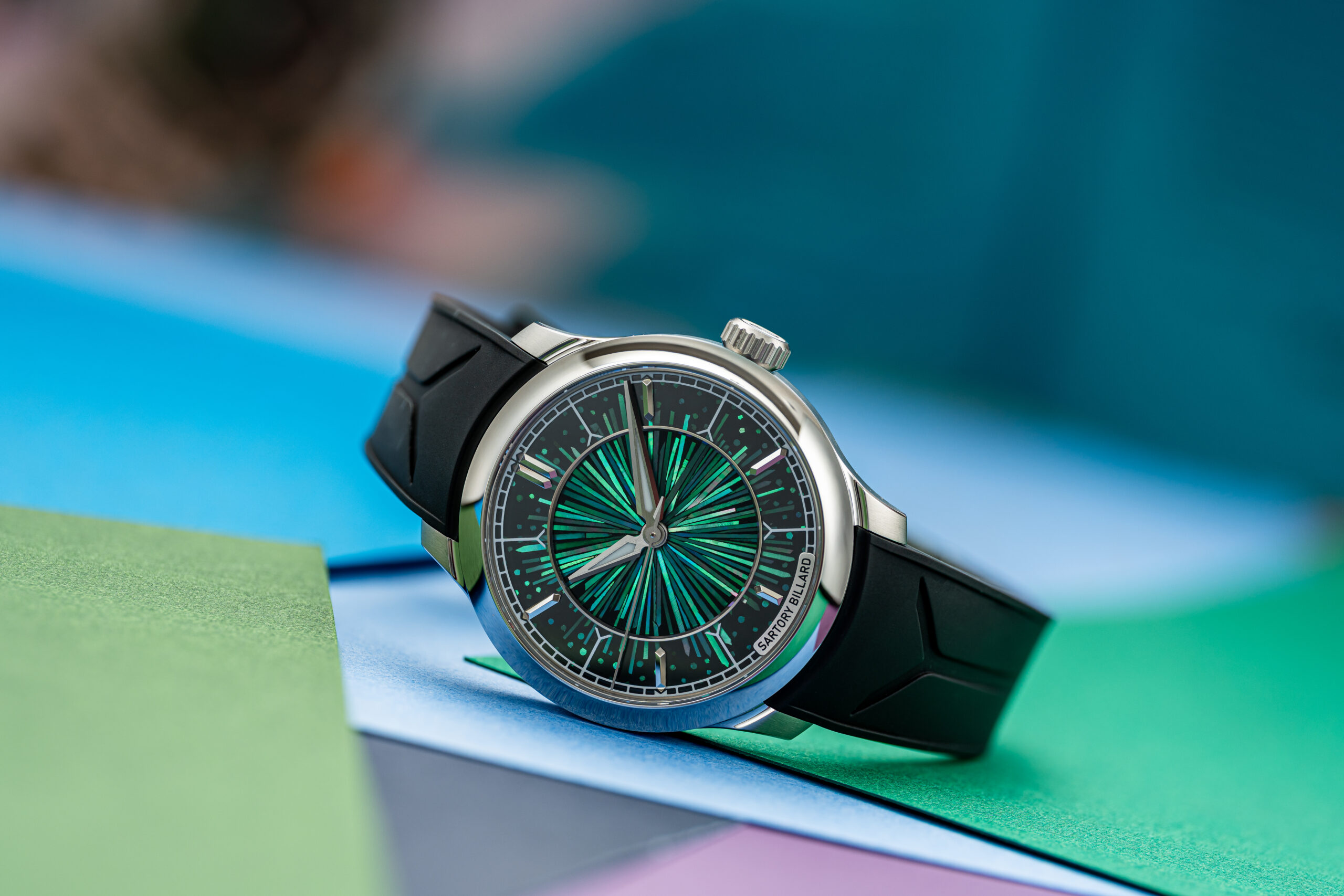 The result is an iridescent canvas alive with shifting shades of green, violet, and blue — a chaotic explosion of light that is unique to each watch and impossible to reproduce.