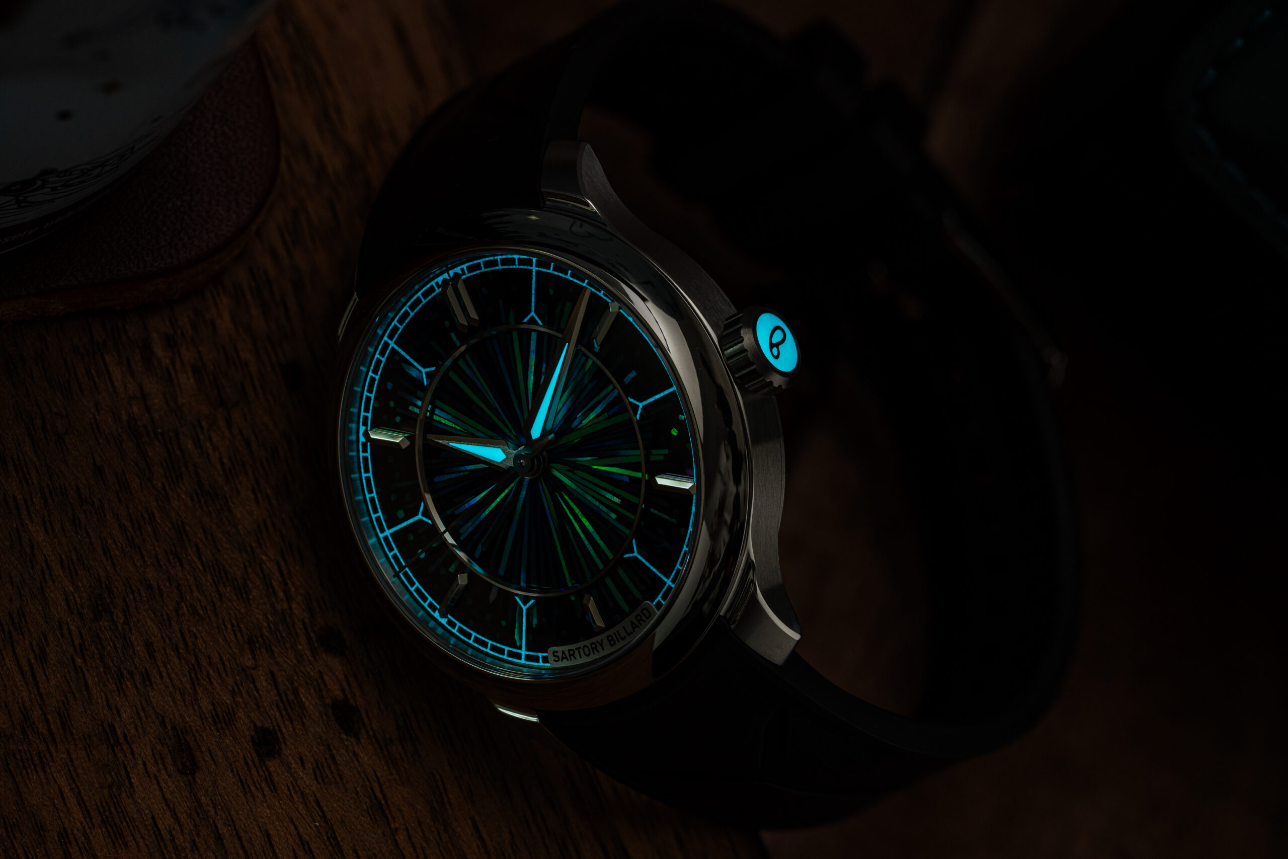 – Sartory-Billard dark blue rubber strap (for the Purple Raden edition)