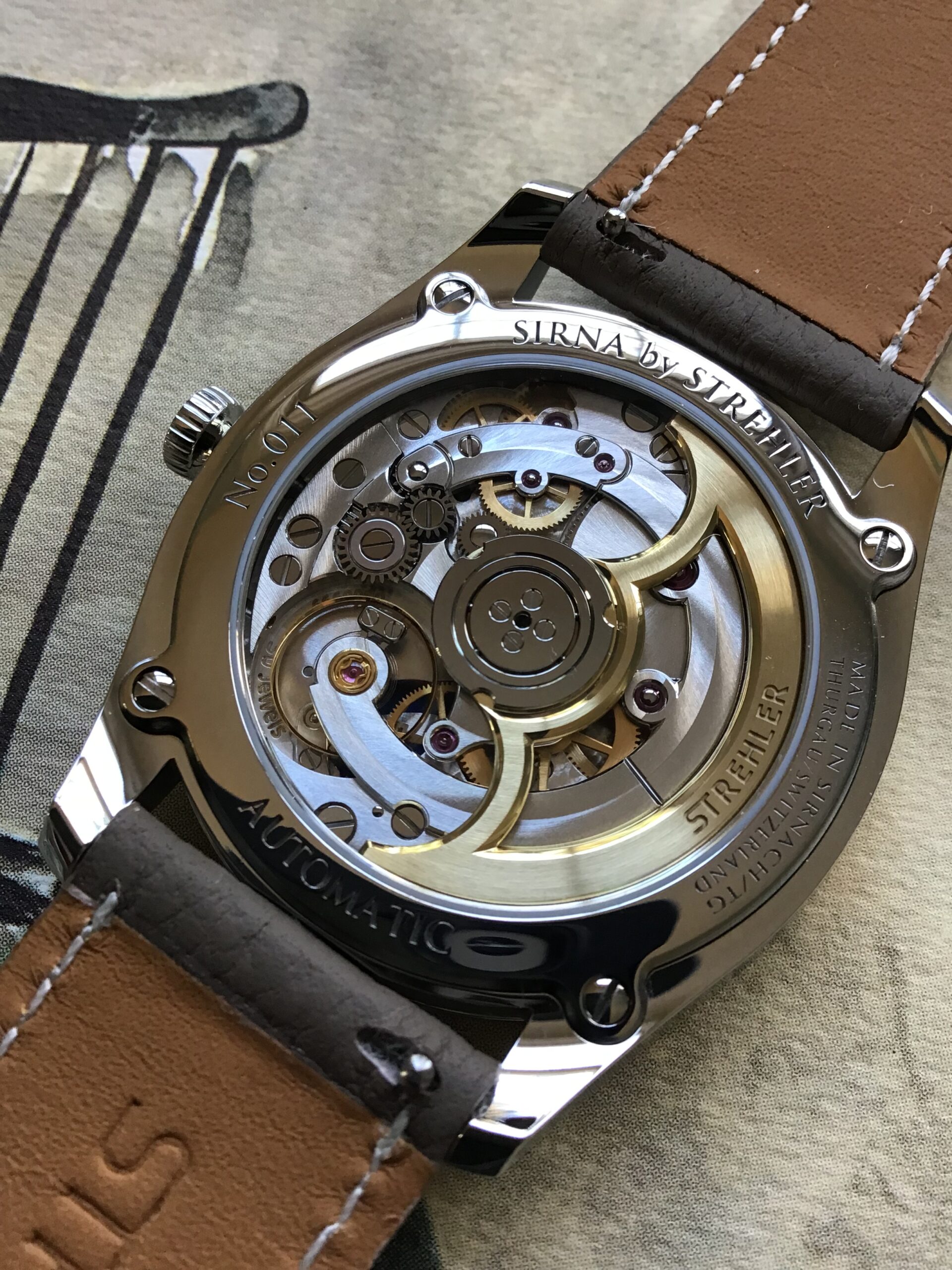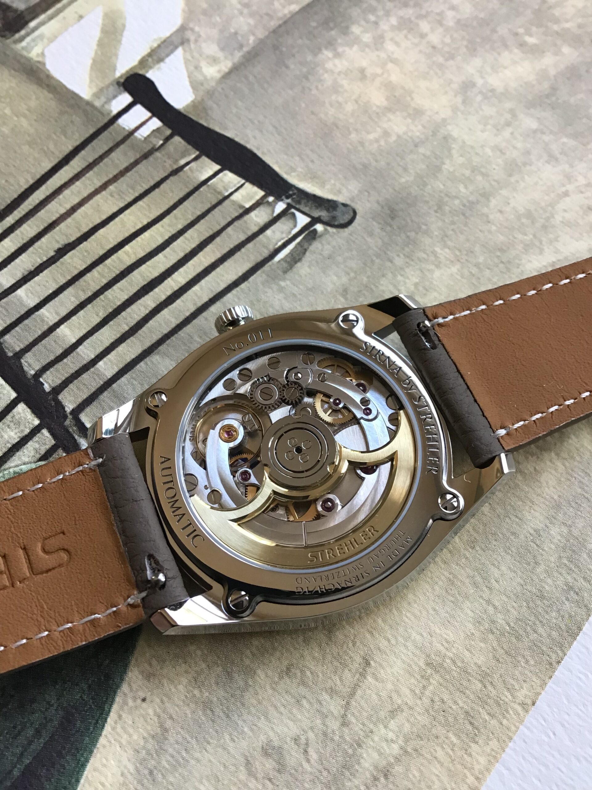 The entire watch, from the movement to the case, dial and hands, is produced by a dedicated team in the brand’s own workshop. Based in Sirnach, a small town of the canton of Thurgau in between lake Constance and the alps, it is one of the very few full-fledged watches manufacture in the German-speaking part of Switzerland.The Sirna is powered by a new automatic movement born from the single-minded pursuit of engineering perfection and the belief that there are no shortcuts. Admirablyblending technical and aesthetic refinement, the SA-30 movement (30mm calibre) is entirely developed, manufactured and finished in-house. Its design was guided by the idea to create a superb, robust and reliable engine. The SA-30 is regulated by a swiss lever escapement special to Strehler and a large free-sprung balance wheel. Its large barrel delivers a particularly constant torque and ensures 60 hours of power reserve. Visible via the exhibition caseback, the impeccable execution of the finishings –chamfered and polished bevels, circular Geneva stripes, graining or circular-grained wheels – all channel the movement’s sophisticated architecture. The bridges and the skeletonised 18k gold rotor create a series of circles that echo the curvature of the case.With its versatile 40 mm diameter and harmonious proportions, the elegant polished steel case feels quintessentially “Strehler”. Its fluid lines add a modern touch: the elongated lugs beautifully extend the case band and gently bend downward for enhanced ergonomics. With its concave profile, the Sirna is particularly thin (8.5 mm) which offers superb comfort on the wrist, making for a great daily wearer. The classic case, case back and bezel construction is water-resistant to 3 atm.