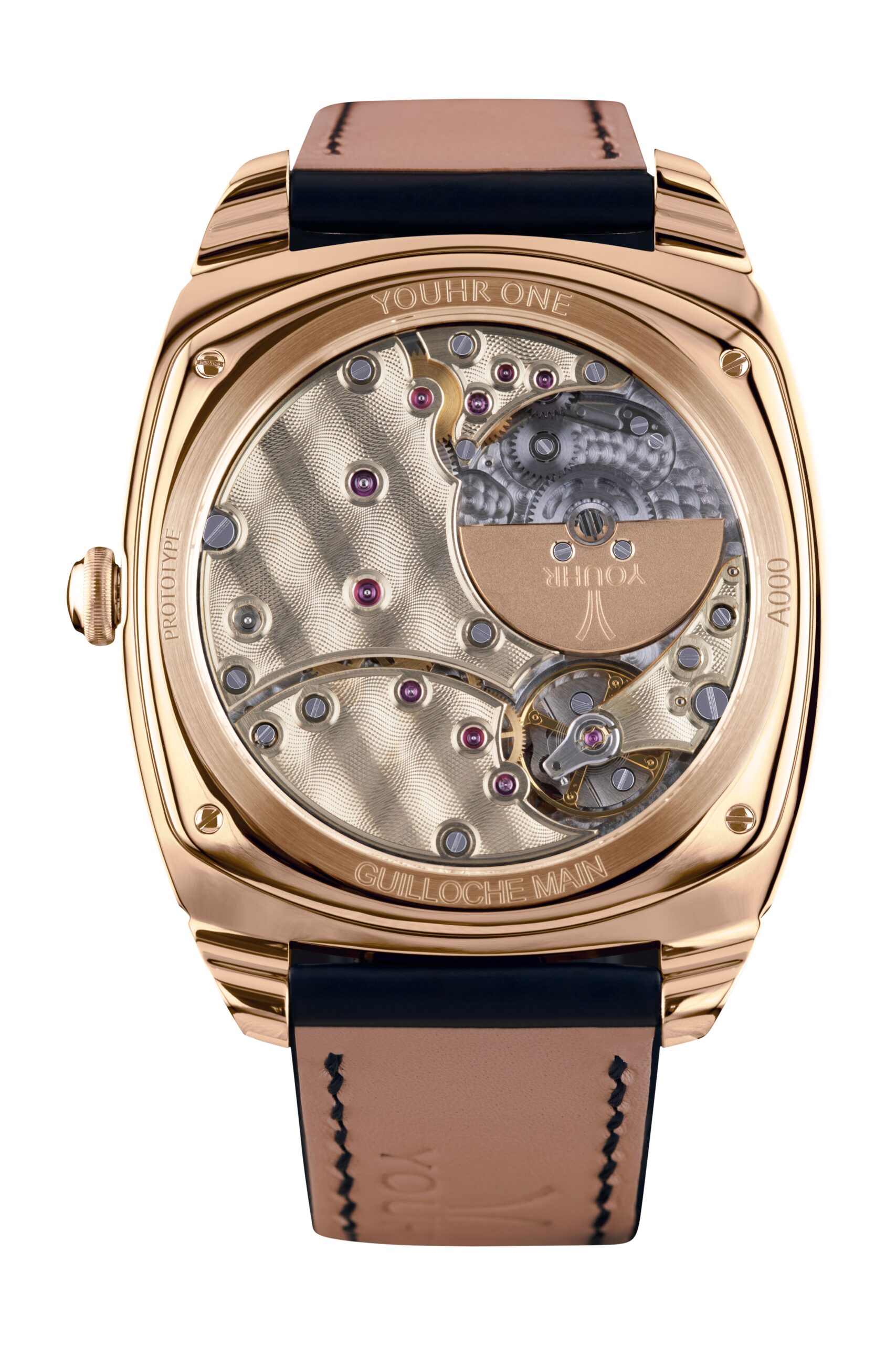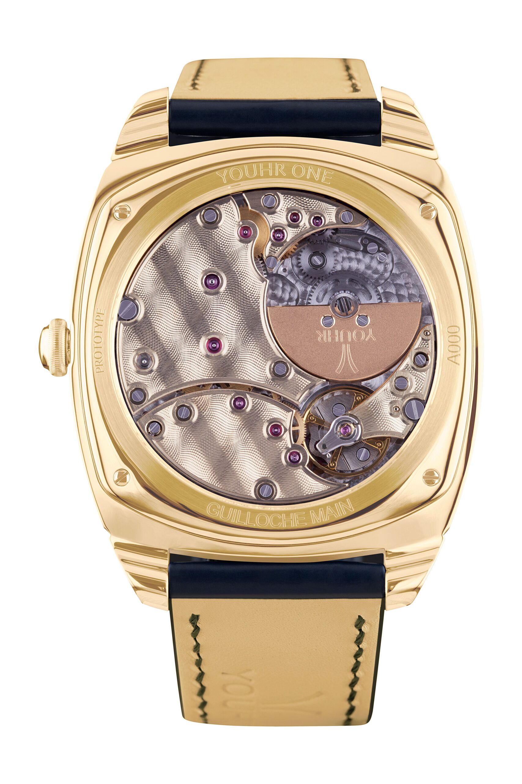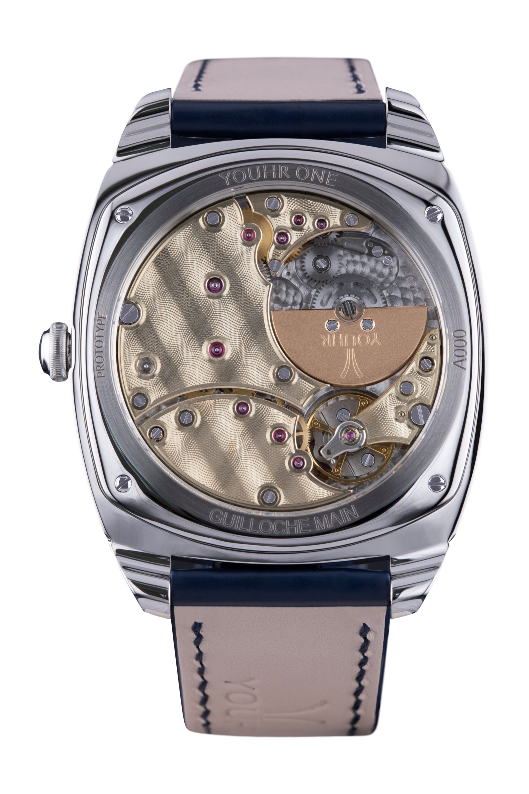 The sapphire case back reveals the extra-flat, self-winding Vaucher Manufacture movement, reference 5400, whose bridges have been designed by Roland Gloor to free up as much of the guilloché surface as possible and express YOUHR’s distinctive design. The bridges were hand-bevelled in the YOUHR workshop. The screw hole contours and edges have been outlined with a stop line, a YOUHR signature of sophistication. The 22-carat gold oscillating weight is also hand-bevelled.The realization of this watch was a challenge requiring solid knowledge and skills to achieve the technical objective of ultra-flatness and the aesthetic objective of elegance. While the entire project was imagined and developed by YOUHR, Roland Gloor’s strength lies in his ability to surround himself with craftsmen with unrivalled skills and expertise, such as in the manufacture of the new movement parts and the guilloché decoration. The work of experts and enthusiasts to create the YOUHR ONE.