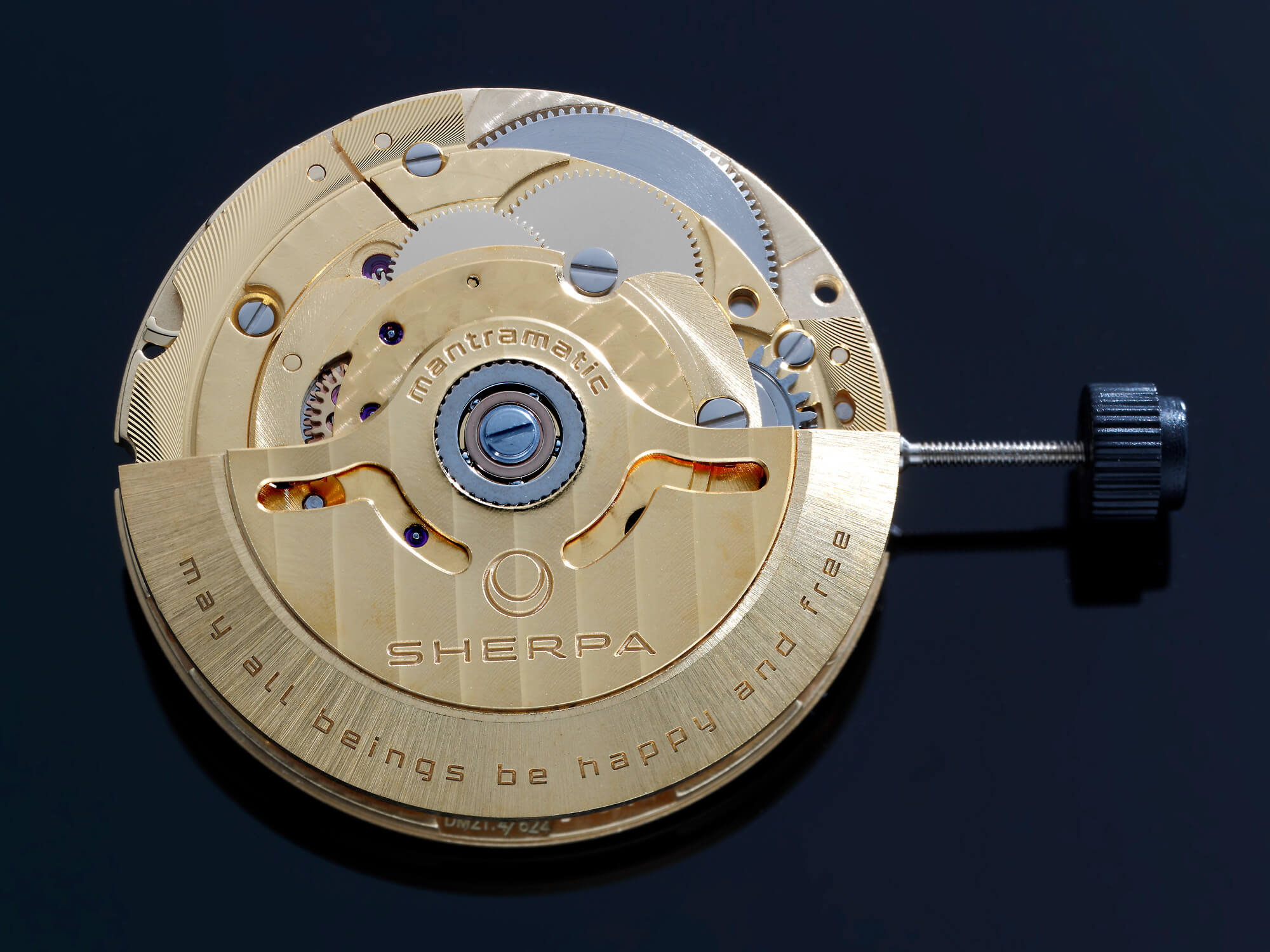 The mechanical movement inside the Ultradive and OPS is not a regular automatic. It is a Mantramatic! Sherpa has microscopically laser engraved a traditional Tibetan Buddhist mantra OM MANI PEME HUNG, which is very commonly used in the Sherpa region on two of the wheels, (using a custom created Tibetan font). Following widespread Himalaya Buddhist tradition used in prayer-wheels, the wheels in the movement rotate constantly, sending out vibes of love, wisdom and compassion from your wrist straight into the world โ 30 million times per year. With the naked eye you will not notice the mantra is there. Instead, you will feel it.